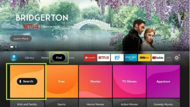 2. Click the Find > Search option on the home screen of Firestick